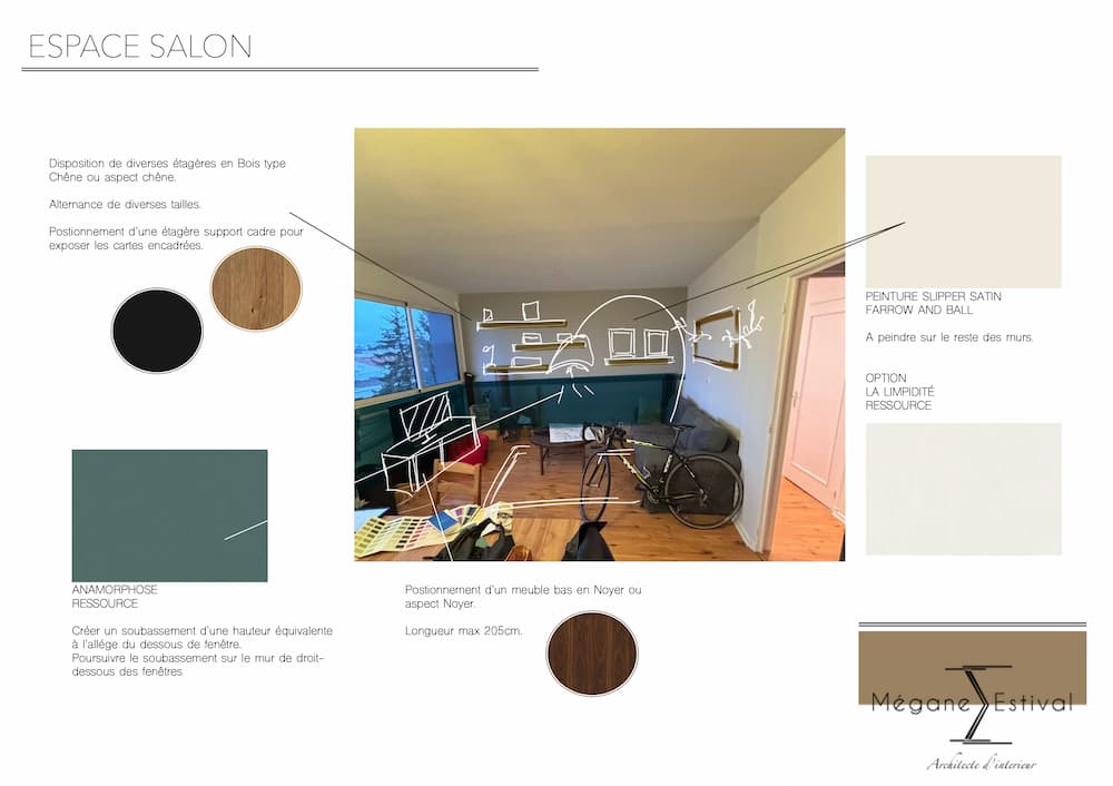À partir de ces éléments de départ, je vous propose des aménagements pour optimiser les espaces et inviter au bien-être. Je vous suggère aussi des possibilités d’ameublement pour rendre la pièce aussi fonctionnelle qu’agréable à vivre. Enfin, je vous adresse un compte rendu reprenant toutes mes propositions afin que vous puissiez les mettre en œuvre.