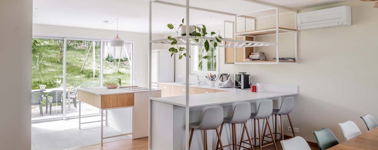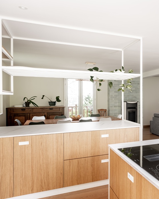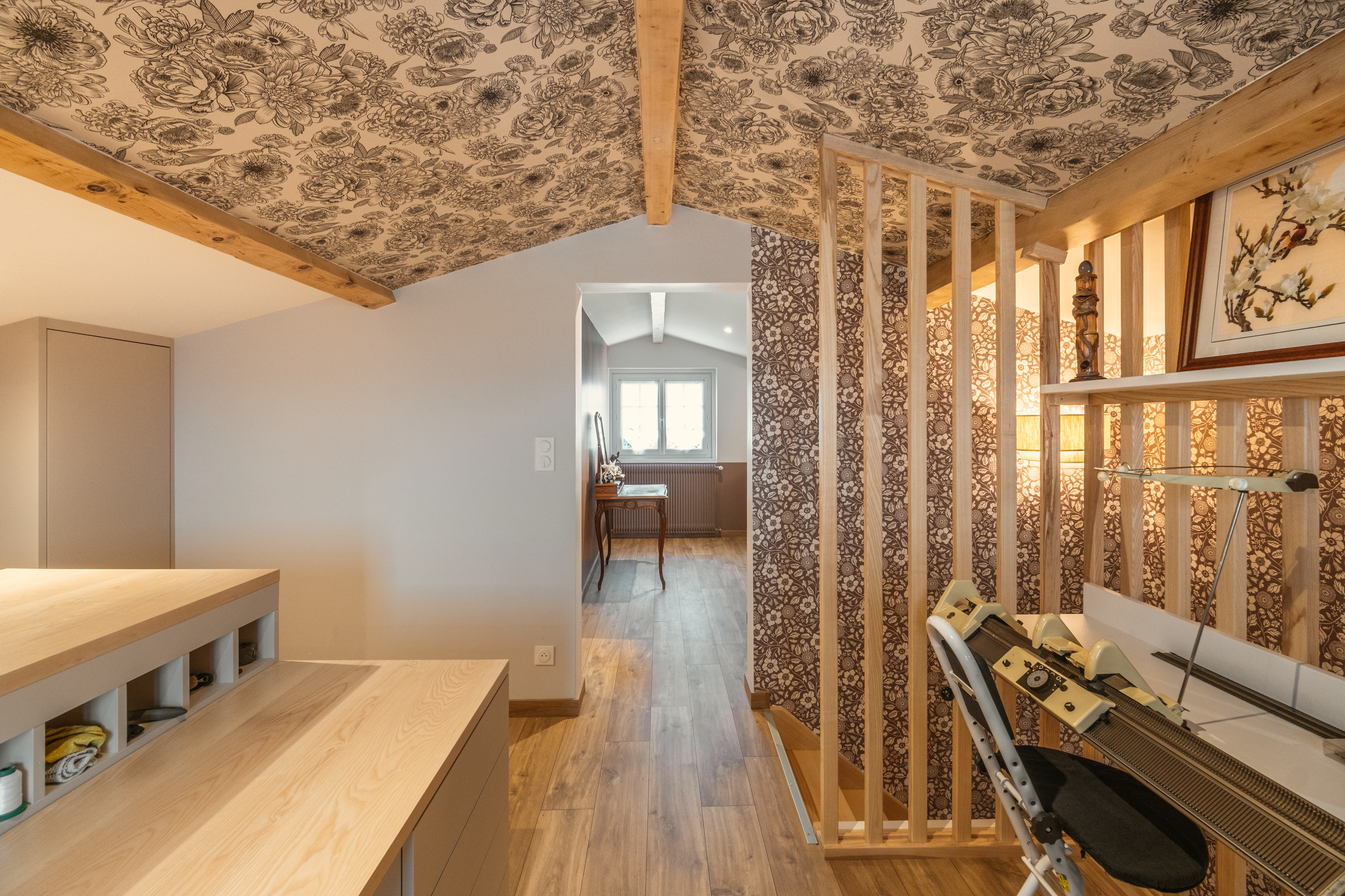 Une nouvelle circulation a permit de lier les diverses zones cloisonnées. Une chambre d’appoint fut également créée. Le tout fut rythmé par du mobilier sur mesure permettant de créer une bibliothèque, un ilot modulable, ainsi que de nombreux rangements.