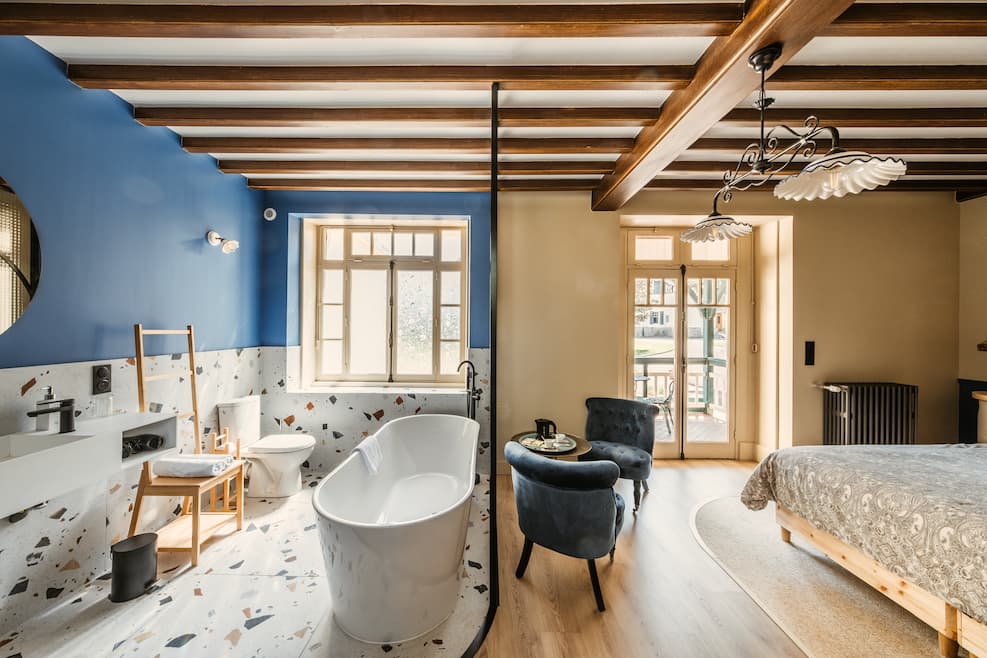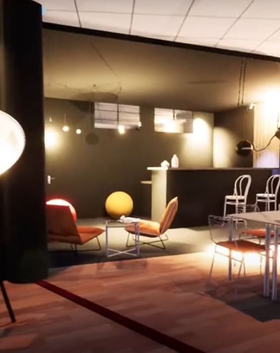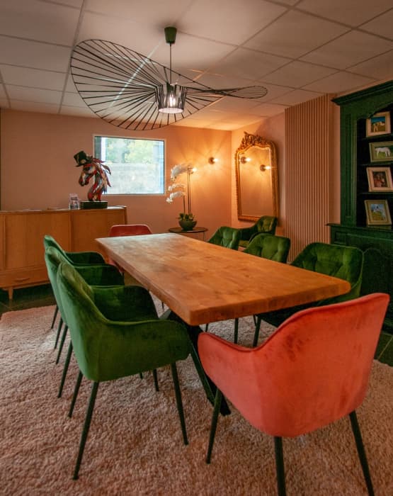 Ambiance loft dans ce vaste accueil ouvert, clair et moderne. Un esprit pop qui s’illustre dans les fresques panoramiques à l’aspect BD ou aux motifs organiques ainsi que dans le mobilier coloré. Grâce aux larges baies vitrées, beaucoup de luminosité, diffusée jusque dans les bureaux par des portes coulissantes en verrières assorties.